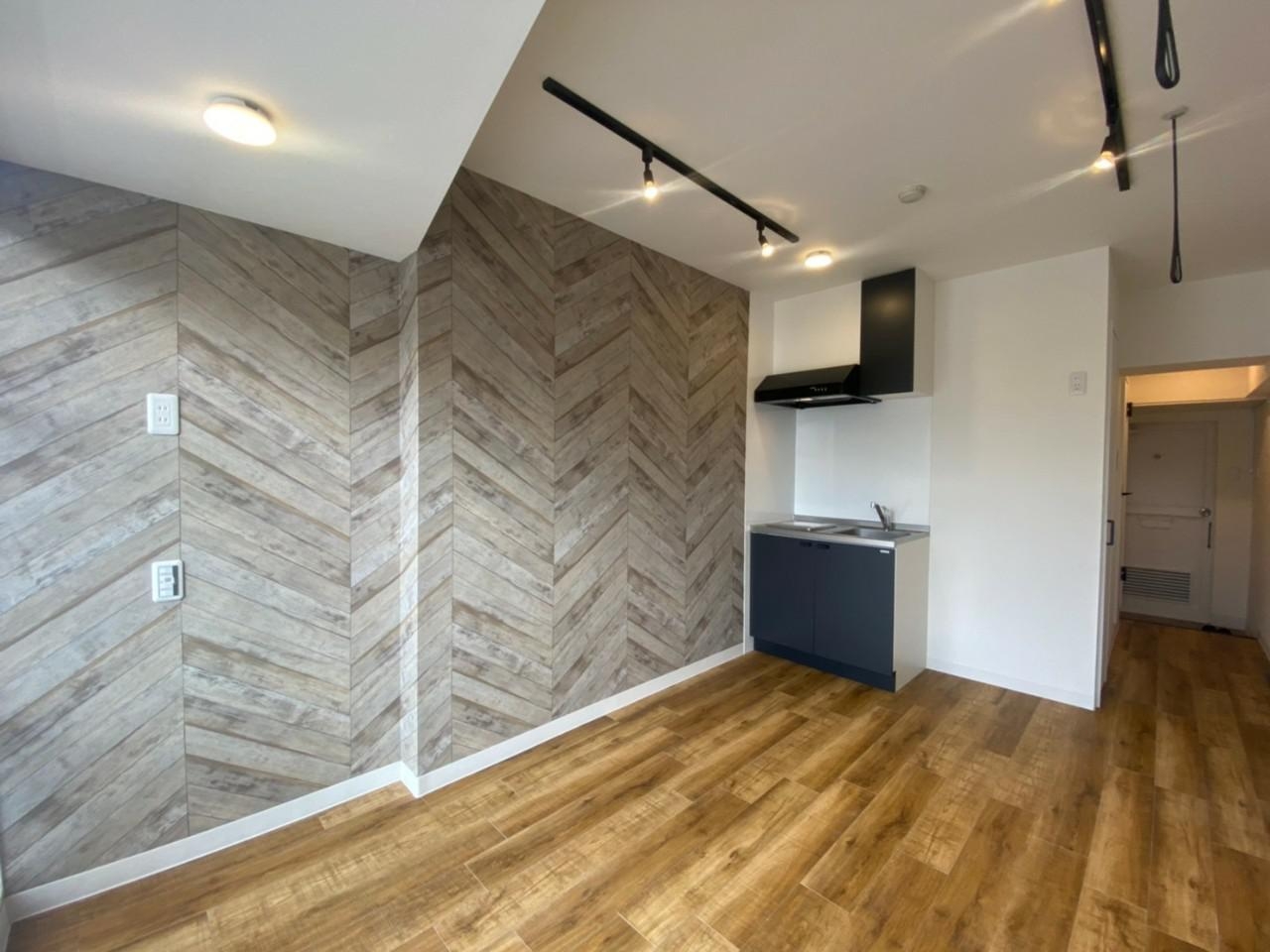 造作棚がなくなり空いた壁面にはヘリンボーン柄の