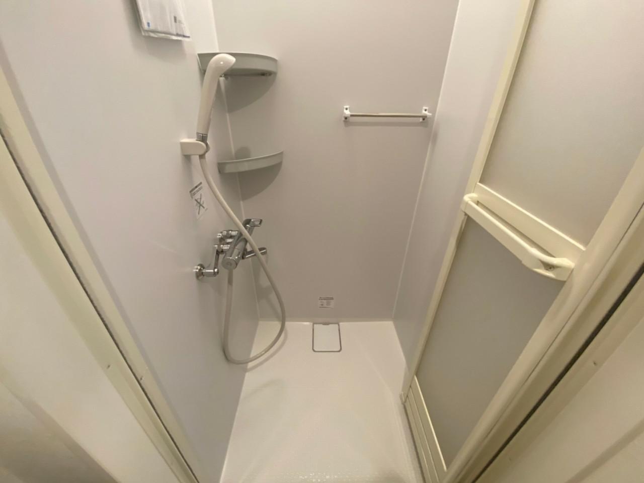 シンプルですが棚付きで清潔感のあるシャワールームです◎
